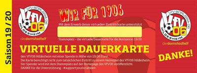 Virtuelle DauerkarteKauft mit der Dauerkarte Euren virtuellen Stammplatz für die 7 ausgefallenen Spiele der Restsaison 19/20. Der Spender zahlt 19,06 Euro und wird auf der Homepage des VfV genannt. (Größere Abbildung in der Galerie) |