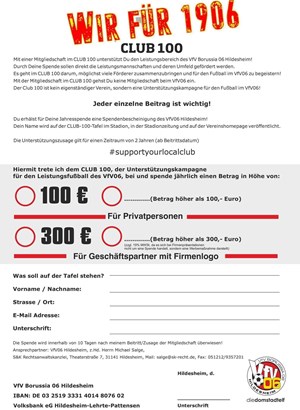 Mitglied im Club 100Mit einem Jahresbeitrag ab 100 Euro seid ihr für zwei Jahre Mitglied im Club 100. Für den Betrag gibts eine Spendenbescheinigung. Euer Name wird auf der Clubtafel im Stadion, im Stadionmagazin und auf der Homepage genannt. |